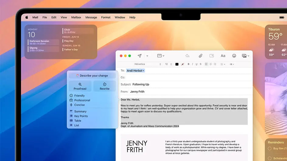 Apple Intelligence introduit des outils de rédaction puissants pour faciliter l’écriture. Vous hésitez sur le ton à adopter pour un e-mail ? Indiquez le contexte à Apple Intelligence pour que le style s’ajuste automatiquement. Grâce à la fonctionnalité ‘Relecture’, Apple Intelligence corrige instantanément l’orthographe, la grammaire et la syntaxe de vos textes. Enfin, l’IA d’Apple est capable de résumer des longs échanges en quelques points essentiels vous faisant ainsi gagner un temps précieux