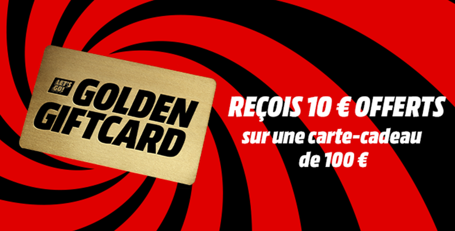 Faites la différence avec la Golden Giftcard MediaMarkt ! Pour toute carte cadeau de 100 € achetée, nous t'offrons 10 € supplémentaires. De quoi vous faire plaisir avec les dernières technologies : smartphones, tablettes, casques audio, accessoires gaming... avec la Golden Giftcard, vous gagnez à tous les coups.