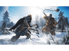 Vikings combattant dans un paysage enneigé, maniant des haches et un fléau. Le ciel est bleu, il y a des arbres.