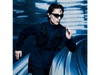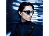 Jeune homme portant des lunettes de soleil, un gilet noir et un écouteur. Fond bleu. Aspect moderne.