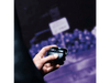 • Charger l'image dans la galerie, Main tenant des écouteurs noirs dans un étui de chargement ouvert, avec un arrière-plan flou d'un magasin.