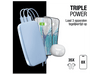 • Charger l'image dans la galerie, Batterie externe bleue avec trois câbles connectés. Deux téléphones et un étui d'écouteurs blanc sont montrés.