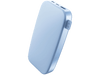 Une batterie externe bleu clair sur fond blanc, légèrement inclinée.