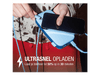 Batterie externe bleue avec trois câbles connectés. Deux téléphones et un étui d'écouteurs blanc sont montrés.