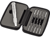 Indispensable pour les travaux de mécanique de précision. Boîte de rangement argentée très élégante. Tient dans une poche de pantalon. Têtes pentagonales permettant d'ouvrir/de réparer les appareils Apple comme l'iPhone. Jeu comprenant :. Une poignée solide entièrement métallique avec un revêtement à rainures antidérapant. 2 têtes de tounevis plates. 2 têtes de tounevis cruciformes. 3 têtes de tournevis Torx. 3 têtes de tournevis pentagonales.