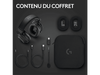 Casque gaming / Oreillettes en mousse à mémoire de forme et similicuir / Oreillettes supplémentaires en mousse à mémoire de forme et tissu / Adaptateur USB-A pour LIGHTSPEED Wireless avec port 3,5 mm / Microphone détachable avec bonnette en mousse / Câble USB-A vers USB-C / Câble 3,5 mm / Étui souple / Manuel / Support pour casque
