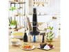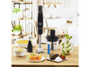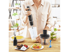 Les accessoires inclus te donnent de nombreuses possibilités pour enrichir ton répertoire de plats. Tu peux hacher des herbes, des noix ou des légumes durs en quelques secondes ou préparer un délicieux pesto. Le fouet fait de la crème ou des blancs d'œufs un jeu d'enfant ; le broyeur à glace te permet de piler des glaçons en un rien de temps pour les utiliser dans des smoothies ou des cocktails, entre autres. Dans le gobelet mélangeur de 800 ml sans BPA tu peux préparer de la mayonnaise maison ou des salsas épicées. Après utilisation, tu peux facilement nettoyer les accessoires au lave-vaisselle.