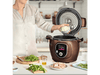 • Charger l'image dans la galerie, Un autocuiseur marron et argenté avec de la vapeur ascendante, fond rouge.