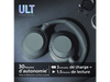 Ce casque sans fil Sony ULT Wear au design noir te permettra de profiter longtemps d'une expérience d'écoute de haute qualité. Outre un design élégant et intemporel et un port confortable, son puissant processeur, connu de la série 1000X, garantit une qualité sonore inimitable. Via Bluetooth, tu l'appaires facilement avec ton smartphone, ta tablette ou ton ordinateur portable. La connexion multipoint te permet même de connecter 2 appareils en même temps ; elle bascule automatiquement sur la source concernée, ce qui te permet par exemple de prendre un appel et de continuer immédiatement à écouter ta musique ou ton podcast. Pour tirer le meilleur parti du casque, appuie sur le nouveau bouton ULT : les modes sonores ULT disponibles (Deep Bass et Attack Bass) font passer ton son au niveau supérieur avec des valeurs de basses profondes. L’ULT Wear délivre un ULT POWER SOUND époustouflant, propulsé par le processeur intégré Sony V1 et des transducteurs de 40 mm, inspirés par le WH-1000XM5. Enfin, la batterie performante te donne 30 heures de capacité, ce qui te permet d'écouter pendant des heures sans jamais avoir à recharger.