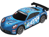 Voiture de course jouet bleue avec détails rouges et logos de sponsors, sur fond noir.